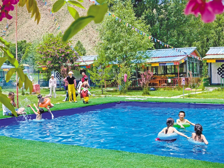 群眾在拉薩市林周縣白定村的林卡營地內玩水嬉戲。記者 洛桑 攝