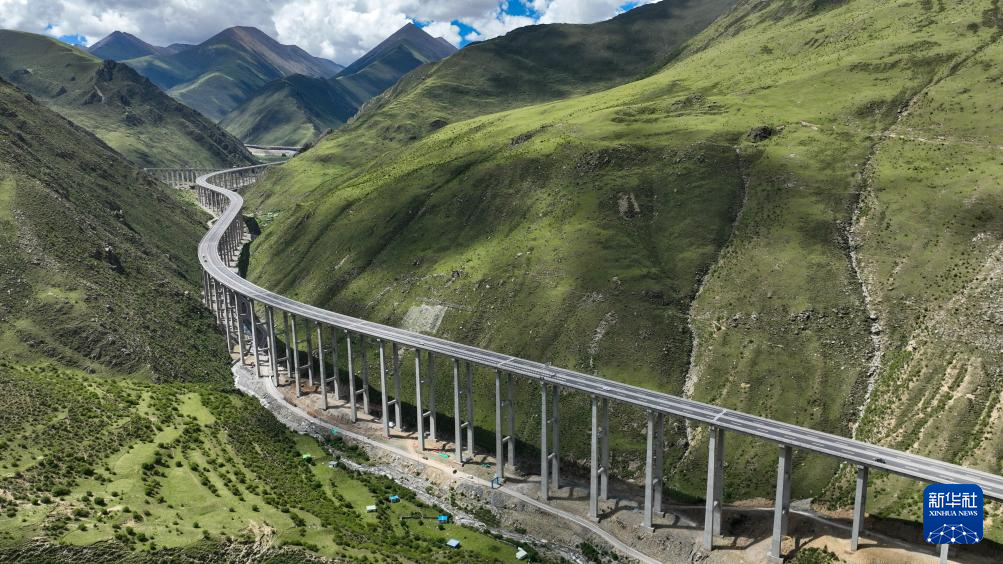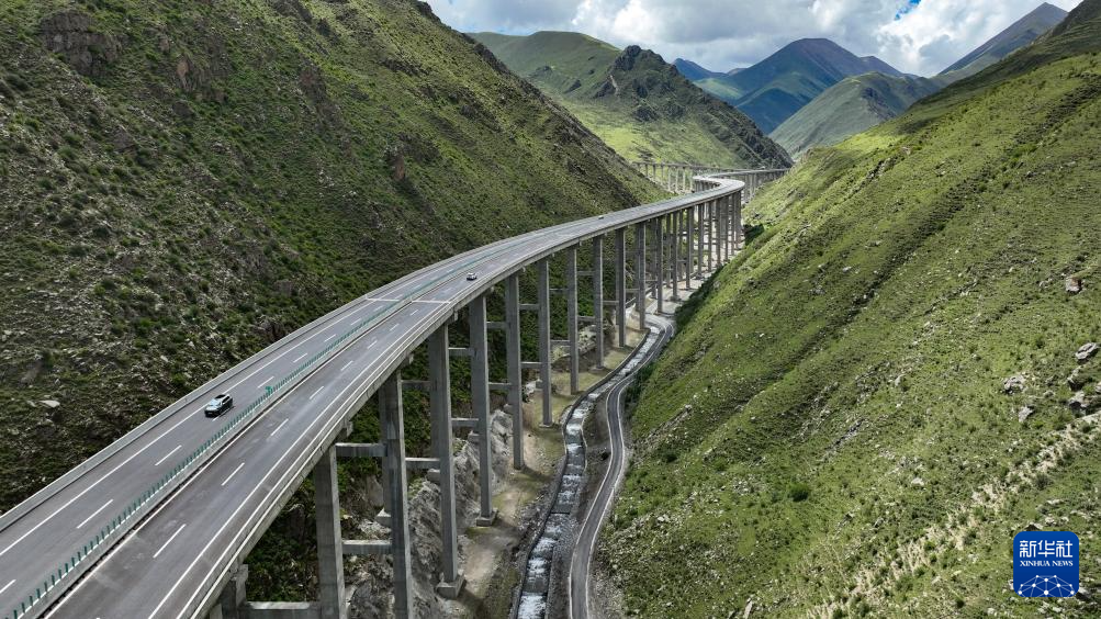 汽車行駛在西藏S5線拉薩至澤當?shù)母叩燃壒飞希o人機照片,2025年7月31日攝)。新華社記者 晉美多吉 攝