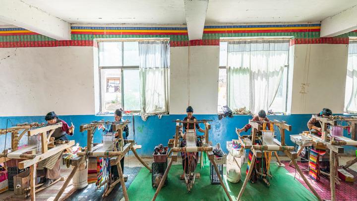 山南市貢嘎縣杰德秀鎮(zhèn)的格桑圍裙農(nóng)牧民專業(yè)合作社里,旦增卓嘎和合作社的婦女在編織“邦典”(2025年4月23日攝)。新華社記者 丁增尼達(dá) 攝