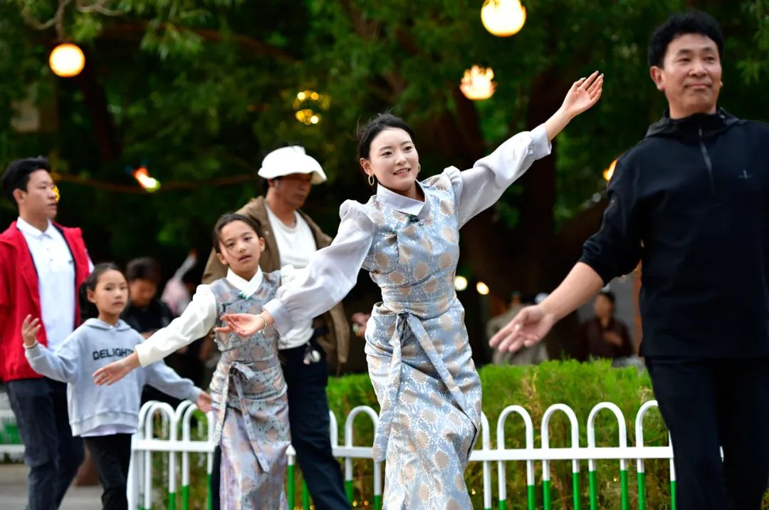 7月13日,西藏昌都瀾滄江天津廣場(chǎng)上,鍋莊舞愛好者踏歌起舞,舞出夏日夜間精彩。