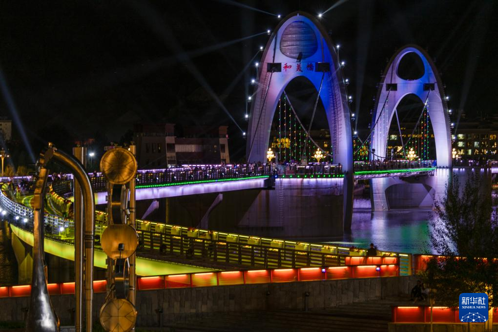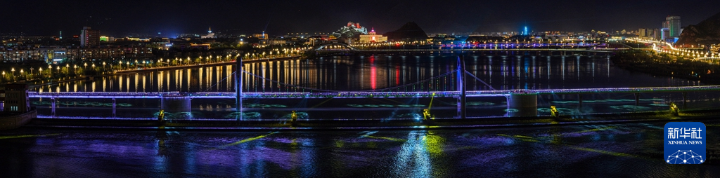 這是7月30日拍攝的拉薩河夜景,由近及遠(yuǎn)分別是和美橋、柳梧大橋和連心橋(無(wú)人機(jī)拼接照片)。新華社記者 姜帆 攝