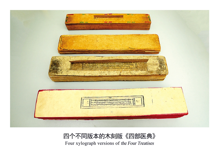 四個不同版本的木刻版《四部醫(yī)典》。自治區(qū)藏醫(yī)院文獻研究所提供