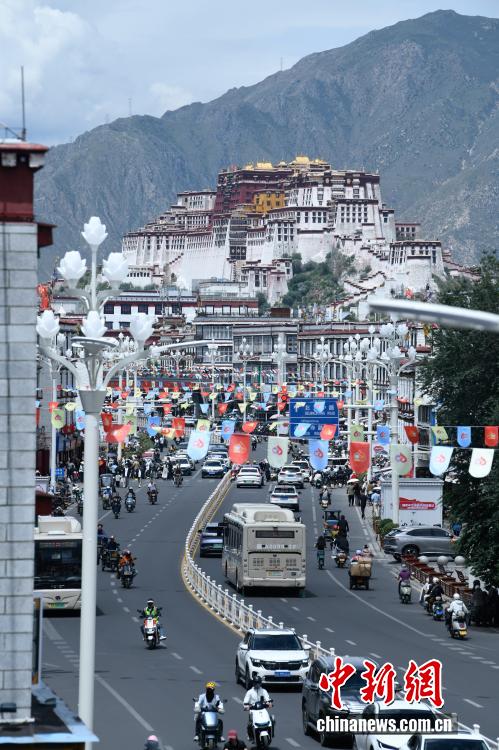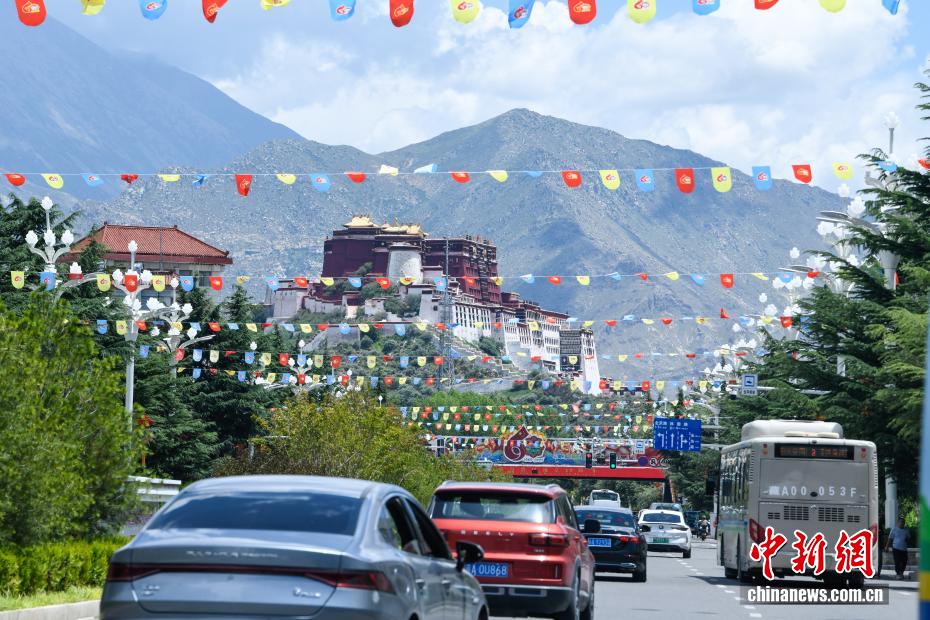 圖為市區(qū)主干道上懸掛的彩旗。中新社記者 貢嘎來松 攝