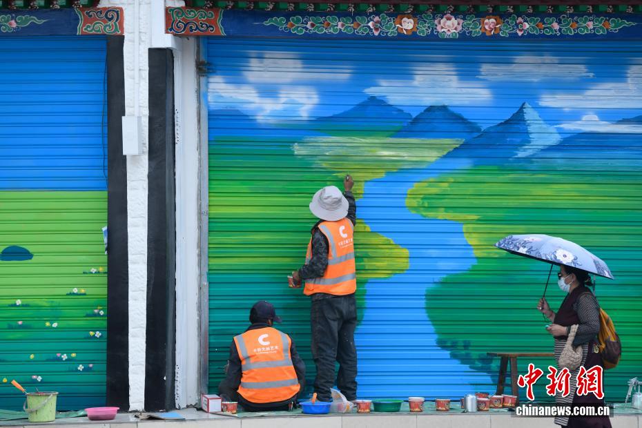 圖為工人在卷閘門上彩繪西藏的山水風景。中新社記者 貢嘎來松 攝