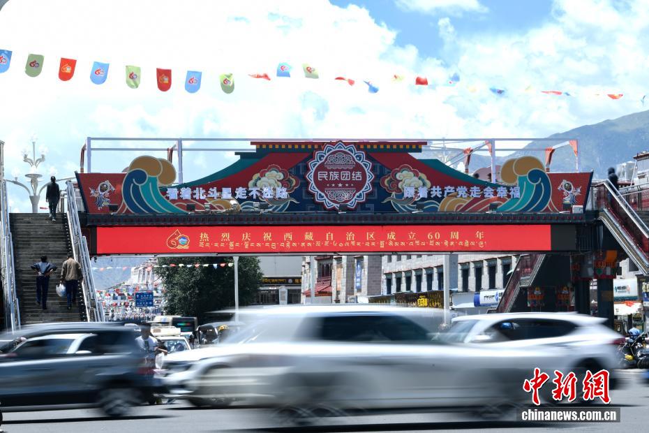 拉薩正以最美姿態(tài),迎接這一重要時刻。圖為裝扮一新的人行天橋。中新社記者 貢嘎來松 攝