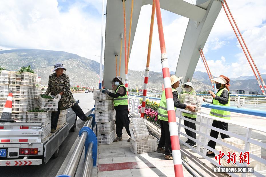 圖為工作人員正緊鑼密鼓地布置花壇。中新社記者 貢嘎來松 攝