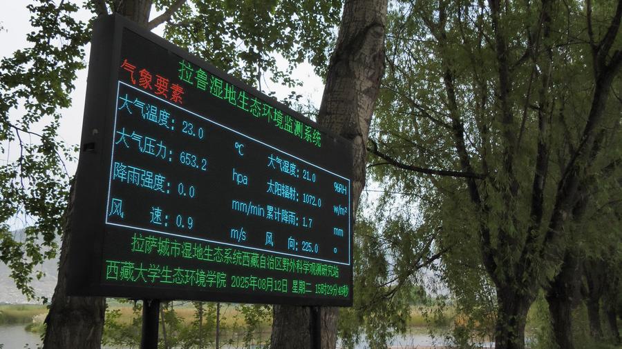 拉魯濕地國家級自然保護(hù)區(qū)南門內(nèi)的生態(tài)環(huán)境監(jiān)測系統(tǒng)顯示屏,實(shí)時(shí)顯示濕地內(nèi)的氣象要素、土壤和水環(huán)境、植被指數(shù)等數(shù)據(jù)。新華社記者 黃智琪 攝