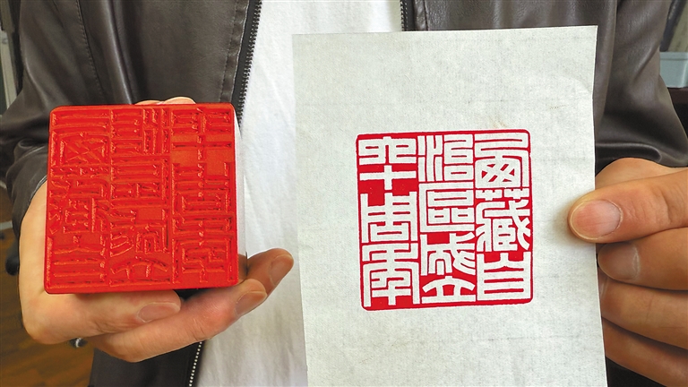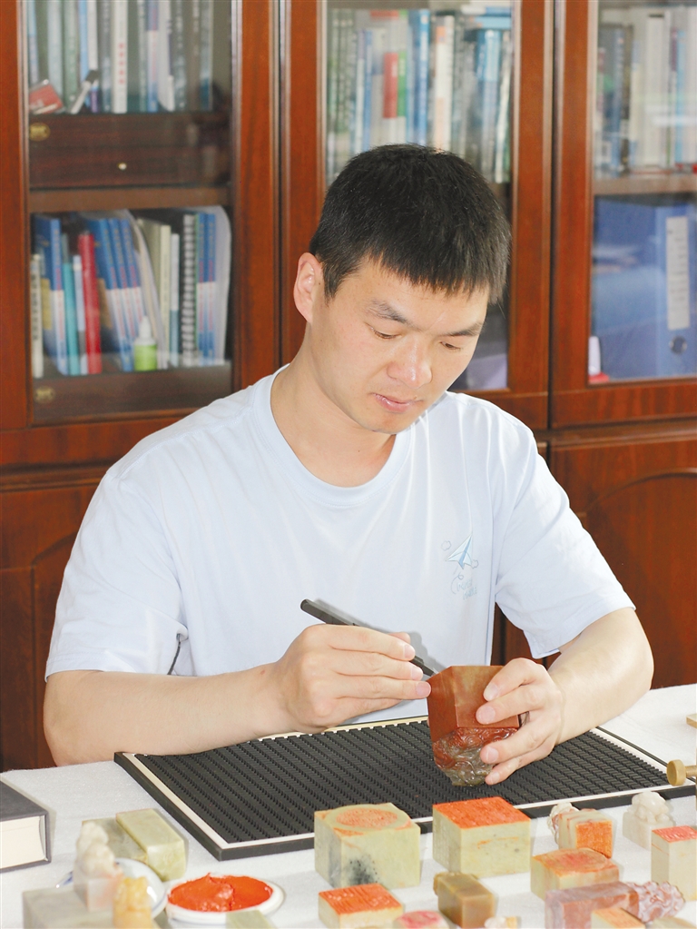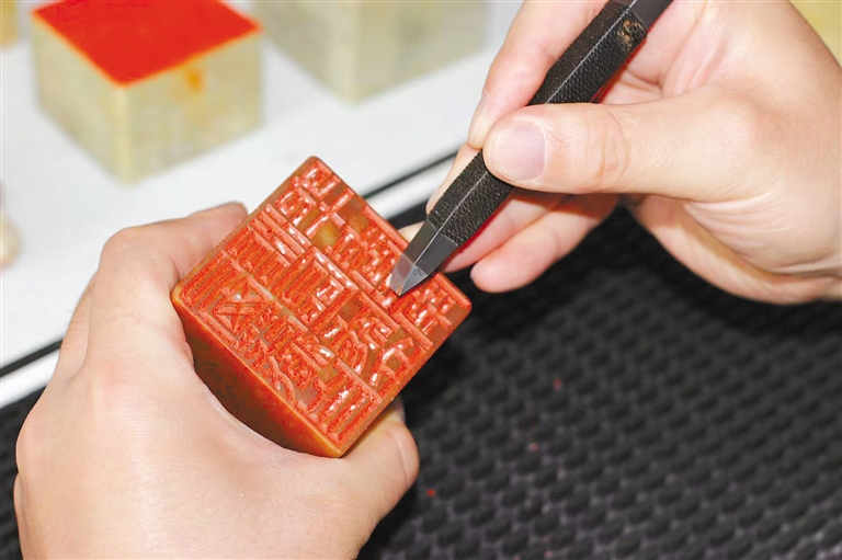 徐帥展示已完成的“西藏自治區(qū)成立60周年”篆刻藝術作品。