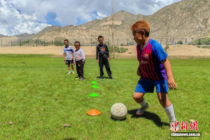 圖為8月12日,一群雙湖搬遷而來的兒童在森布日安置點一處草地上練習(xí)足球。江飛波 攝