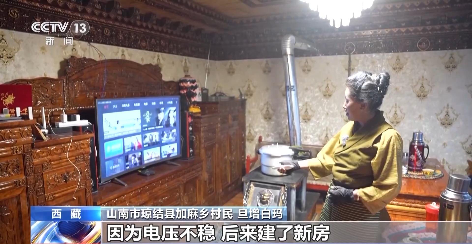 山南市瓊結(jié)縣加麻鄉(xiāng)村民 旦增白瑪:這個(gè)是2023年新建的,這邊是以前住的地方,只有一個(gè)燈泡,其他家電也不敢用,因?yàn)殡妷翰环€(wěn)。后來建了新房,現(xiàn)在電壓穩(wěn)了,可以放心看電視,而且還買了很多新家電,冰箱、洗衣機(jī)、電視。