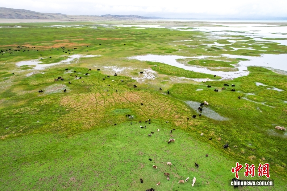 在西藏阿里地區(qū)普蘭縣霍爾鄉(xiāng),牧民在瑪旁雍錯濕地上放牧牦牛。(無人機(jī)照片)中新社記者 張祥毅 攝