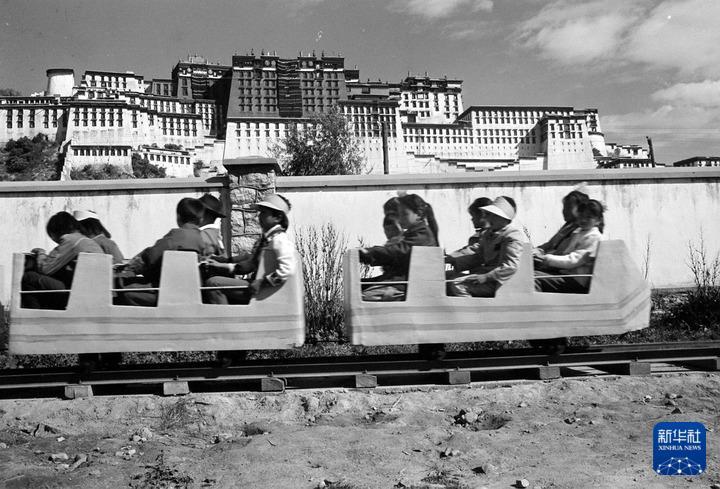 1987年10月1日,在拉薩勞動人民文化宮內新建成的大型游樂場里,小朋友們在乘坐電動小火車。