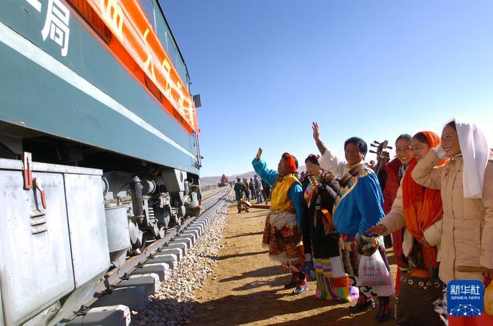 2004年10月10日,藏北群眾迎接火車抵達那曲。10月9日,青藏鐵路安多至那曲138公里鐵軌鋪設完成。10月10日,從安多出發(fā)的、西藏境內第一列火車,于上午10時抵達當時的藏北重鎮(zhèn)——那曲鎮(zhèn)。