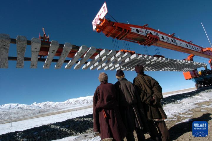 2004年12月5日,在西藏那曲境內,藏族群眾觀看青藏鐵路鐵軌鋪設過程。