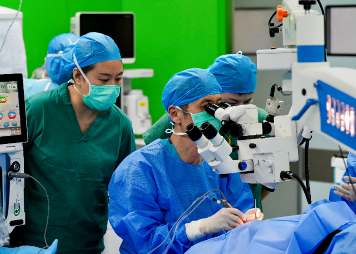 魏文斌帶領(lǐng)的眼科專家團(tuán)隊手術(shù)及帶教現(xiàn)場(施術(shù)者為史翔宇教授)