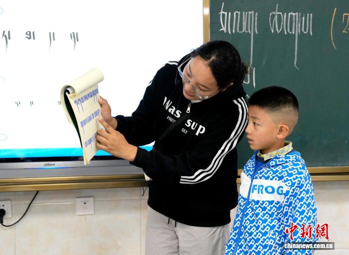 9月1日,拉薩市第一小學(xué)一年級(jí)二班,藏語(yǔ)文老師扎西央欽正在輔導(dǎo)學(xué)生。近日,西藏拉薩市秋季學(xué)期開(kāi)學(xué),各項(xiàng)教學(xué)工作有序開(kāi)展。中新社記者 李林 攝