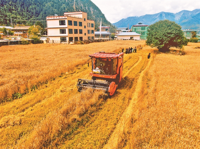 在拉薩市墨竹工卡縣唐加鄉(xiāng)莫沖村,田間地頭繁忙景象撲面而來。幾臺(tái)大型收割機(jī)轟鳴著在金色的農(nóng)田里來回穿梭,收割、脫粒一氣呵成,村民們跟在機(jī)器后方,有條不紊地進(jìn)行后續(xù)整理工作,呈現(xiàn)出一派熱火朝天的豐收?qǐng)鼍?。村民貢嘎頓玉向記者介紹,“我家共有37畝農(nóng)田,10畝種小油菜,27畝種青稞。以前全家4口上陣得忙上一個(gè)多月,現(xiàn)在有了機(jī)械化作業(yè),短短幾天就能完成所有秋收工作,既省時(shí)又省力。”