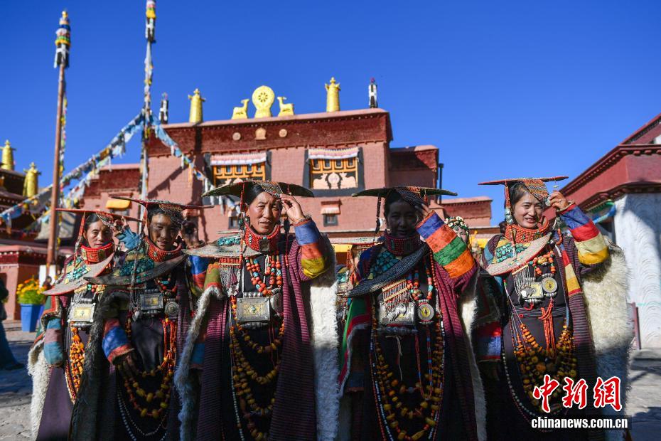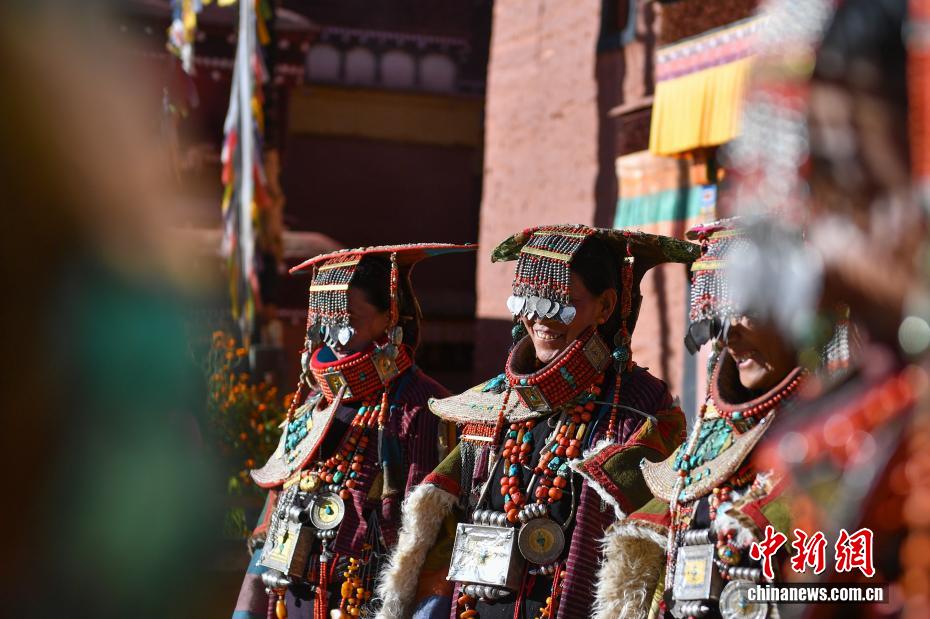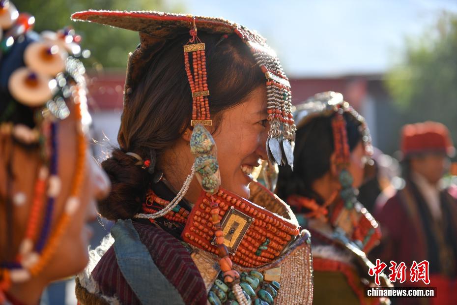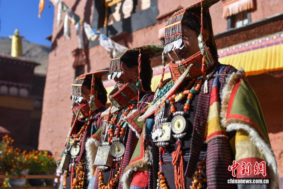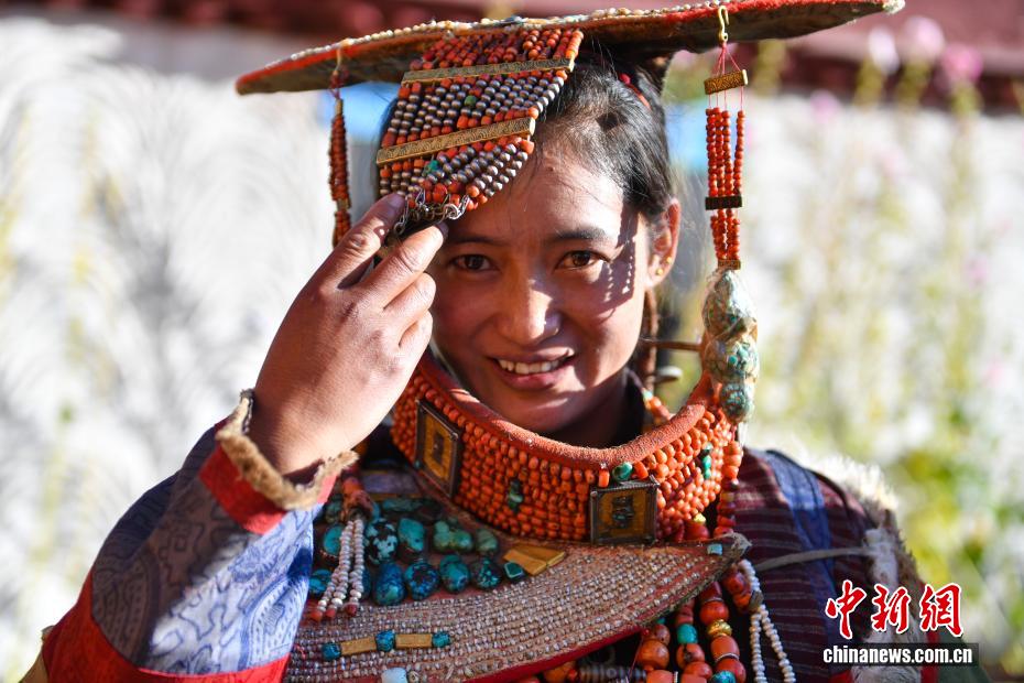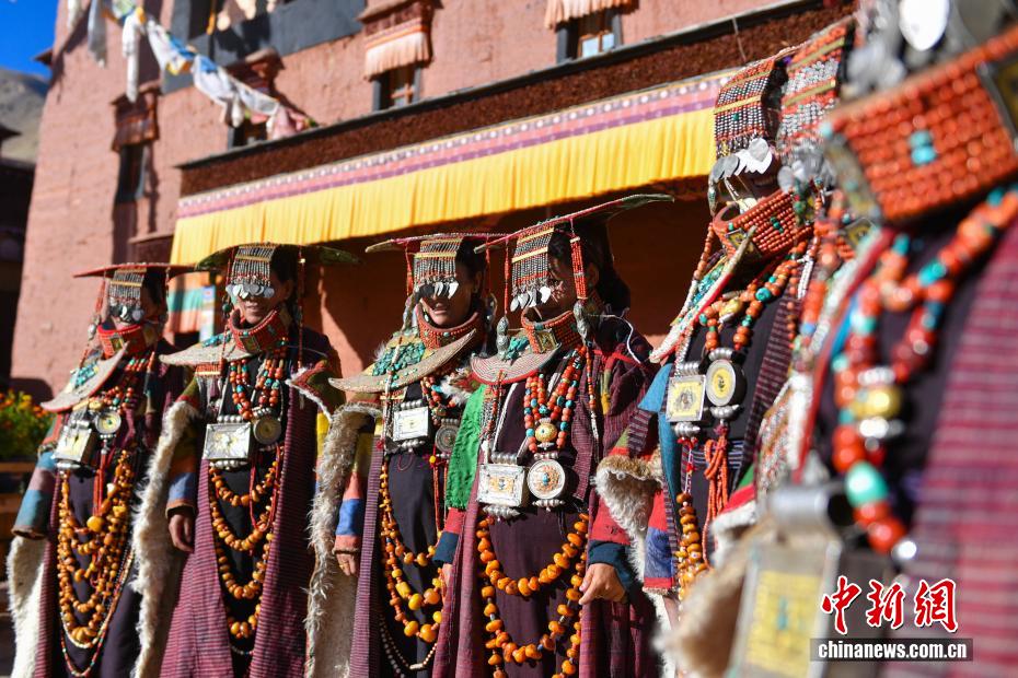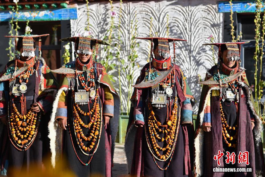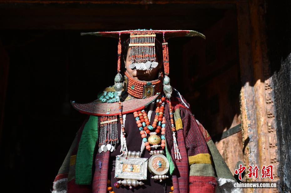 9月23日,西藏自治區(qū)阿里地區(qū)普蘭縣,至今保留著獨(dú)特的藏族服飾——普蘭服飾,它是中國國家級(jí)非物質(zhì)文化遺產(chǎn)。普蘭服飾已有1000多年的歷史,其中最精美、最獨(dú)特的是婦女的“孔雀服飾”,普蘭縣科迦村里有7戶人家保存著7套祖?zhèn)鞣?,一套重達(dá)20多公斤,裝飾有黃金、白銀、松石、瑪瑙、珊瑚、珍珠等,承載和沉淀了百年時(shí)光,堪稱“穿在身上的千年史”。時(shí)至今日,這種美麗的服飾文化還在當(dāng)?shù)貍鞒兄?。圖為西藏阿里地區(qū)普蘭縣科迦村,村民在展示普蘭服飾。貢確 攝