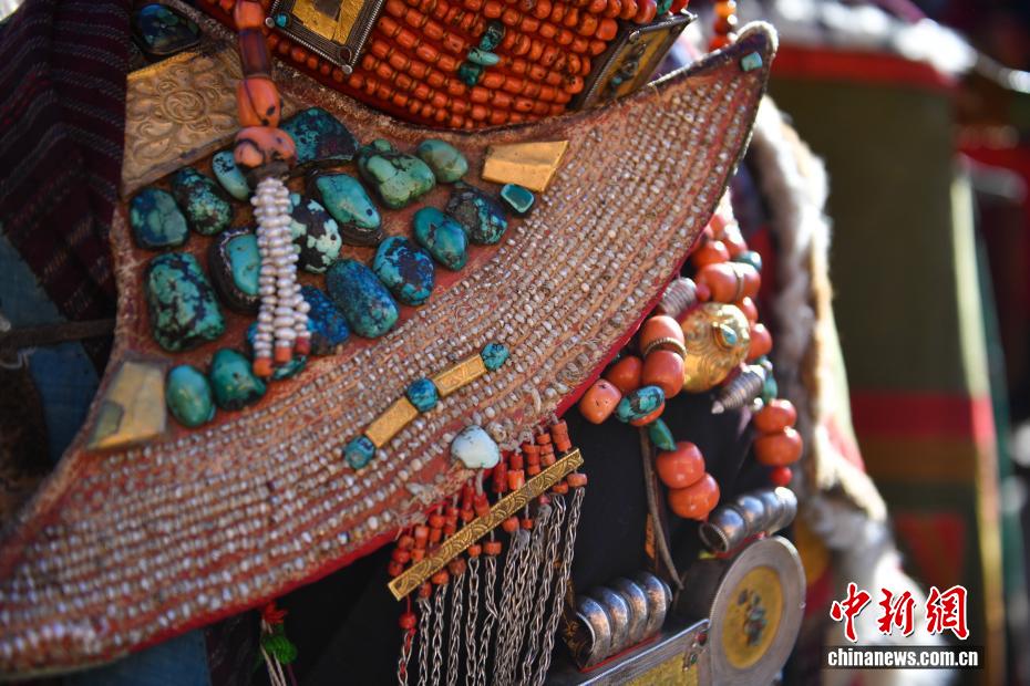 9月23日,西藏自治區(qū)阿里地區(qū)普蘭縣,至今保留著獨(dú)特的藏族服飾——普蘭服飾,它是中國國家級(jí)非物質(zhì)文化遺產(chǎn)。普蘭服飾已有1000多年的歷史,其中最精美、最獨(dú)特的是婦女的“孔雀服飾”,普蘭縣科迦村里有7戶人家保存著7套祖?zhèn)鞣?,一套重達(dá)20多公斤,裝飾有黃金、白銀、松石、瑪瑙、珊瑚、珍珠等,承載和沉淀了百年時(shí)光,堪稱“穿在身上的千年史”。時(shí)至今日,這種美麗的服飾文化還在當(dāng)?shù)貍鞒兄D為普蘭服飾細(xì)節(jié)展示。貢確 攝