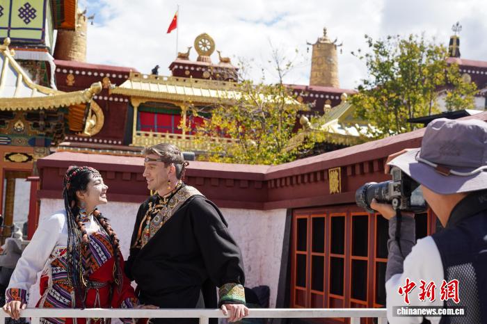 9月28日,西藏拉薩大昭寺、八廓街,來自意大利、烏克蘭、墨西哥等國的游客,身著色彩艷麗的藏族傳統(tǒng)服飾,在金頂紅墻的映襯下拍照留念。圖為來自意大利的游客身著藏裝在大昭寺廣場(chǎng)拍照留念。中新社記者 貢嘎來松 攝