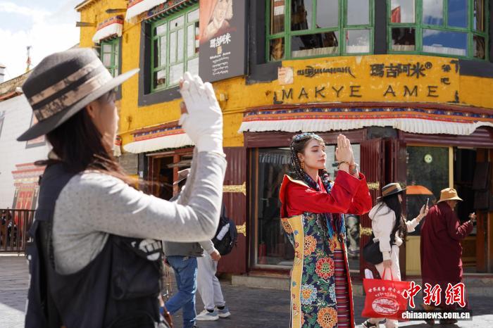 圖為來自墨西哥的游客身著藏裝在大昭寺廣場(chǎng)拍照留念。中新社記者 貢嘎來松 攝