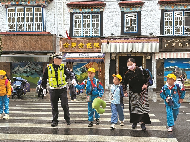 圖為拉薩市公安局交通管理支隊民警幫助獨行的學生穿過車流。記者 鹿麗娟 攝