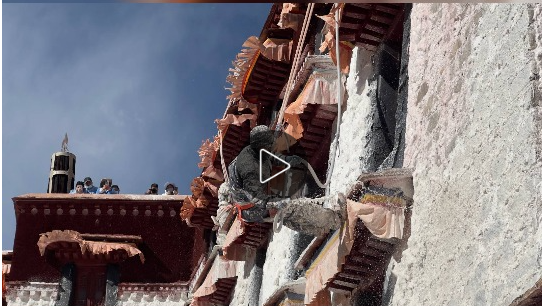 布達拉宮迎來了一年一度的“煥新”計劃,來自布達拉宮管理處的專業(yè)人員,與當(dāng)?shù)孛癖?、熱心志愿者們共同投入到這場“年度美容”工程中,為這座擁有千年歷史的古老宮殿披上潔白莊嚴的“新衣”。參與涂墻的民眾,身上、頭發(fā)上都沾滿了白色的涂料,仿佛落了一層細雪。同時,一桶桶涂料被有序地傳送并潑灑在墻面上,布達拉宮這座屹立千年的宮殿在陽光下也愈發(fā)明亮。除此之外,大昭寺、色拉寺等大大小小的寺廟及民居的房屋也會開始粉刷,這一工作將在藏歷九月二十二日之前完成。