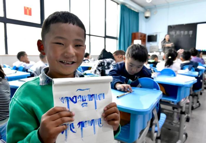 2024年8月20日,拉薩市第一小學一年級八班迎來藏語文課。圖為學生展示書寫的藏文。中新社記者 李林 攝