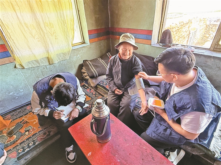 圖為當雄縣羊八井鎮(zhèn)民政服務(wù)站工作人員入戶為特供分散戶老人做基礎(chǔ)生命體征檢查。