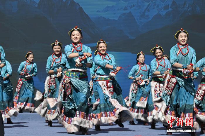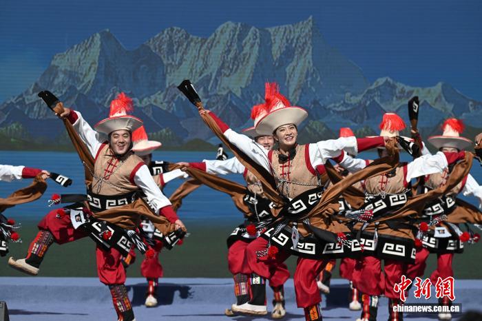 圖為阿里地區(qū)改則縣藝術(shù)團表演舞蹈《歡舞幸?!じ膭t情》。中新社記者 貢嘎來松 攝