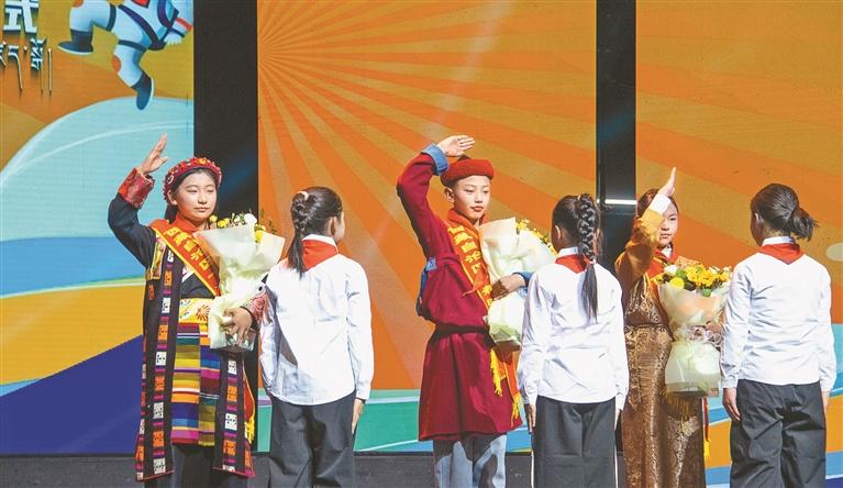 圖為在2024—2025年西藏自治區(qū)“新時代好少年”先進(jìn)事跡發(fā)布儀式上,少先隊員代表為“新時代好少年”獻(xiàn)花。記者 旦增嘎瓦 攝