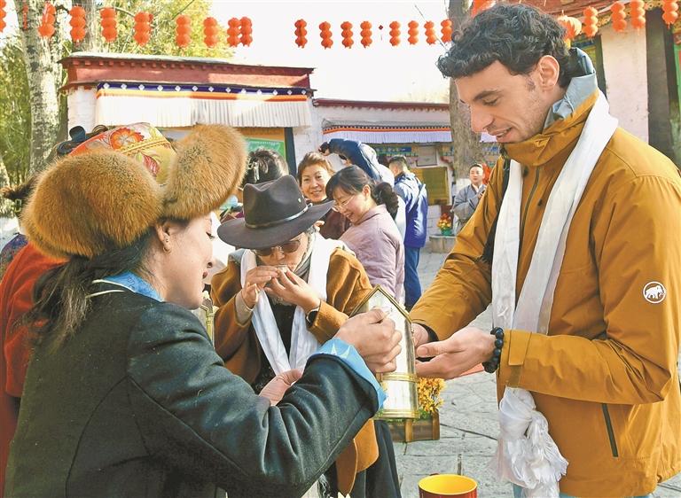 近日,在羅布林卡景區(qū),中外游客共品青稞美酒,感受民俗風(fēng)情。記者 王敏 攝