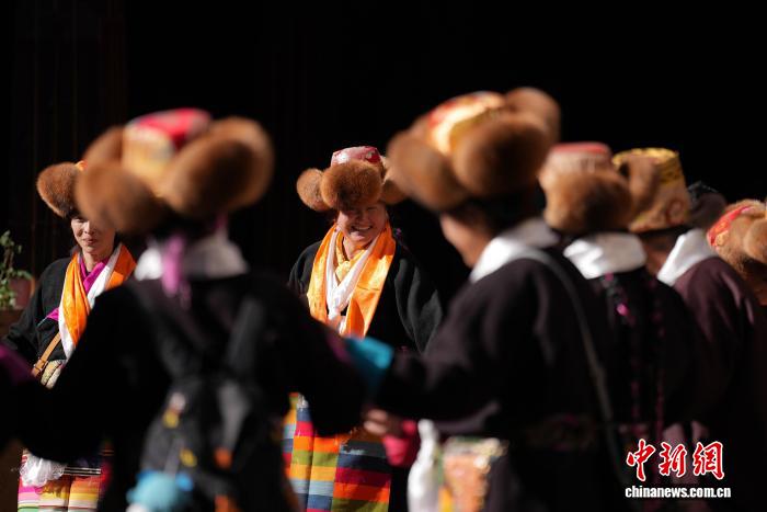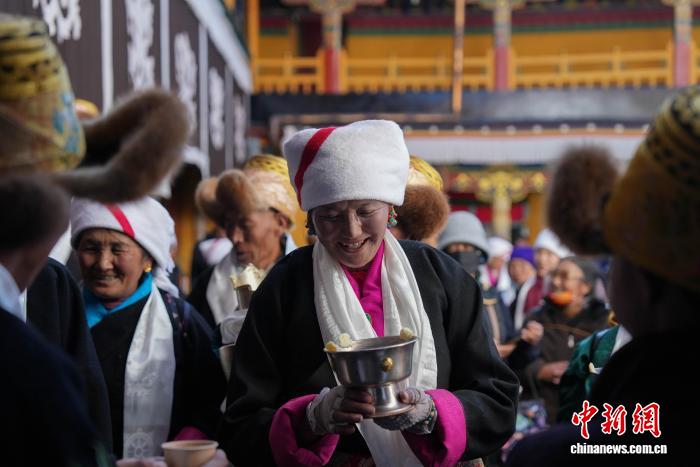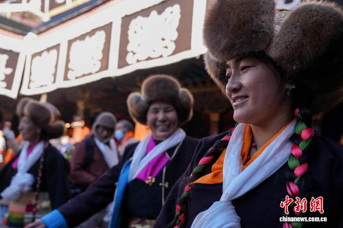 11月28日,隨著藏歷十月十五白拉姆節(jié)臨近,連日來,拉薩及周邊信眾身著色彩艷麗的藏裝節(jié)日盛裝,手持從家中精心準備的頭等青稞酒、新收的青稞及新鮮水果,陸續(xù)前往大昭寺、色拉寺、哲蚌寺等寺廟朝拜祈福。大昭寺內,信眾敬獻供品后載歌載舞,歌聲悠揚、舞步輕快,盡顯節(jié)日喜悅。白拉姆節(jié)又稱 “仙女節(jié)”。相傳,白拉姆是拉薩地區(qū)的保護神,是藏傳佛教最高護法神之一班丹拉姆的女兒。白拉姆曾與大昭寺護法神赤尊贊相互愛慕并私定終身,其母親班丹拉姆發(fā)現(xiàn)后,赤尊贊被趕到拉薩河南岸,每逢藏歷十月十五日,二人才能隔河相見一次。圖為白拉姆節(jié)臨近之際,信眾在大昭寺內敬獻供品后載歌載舞的場景。貢確 攝