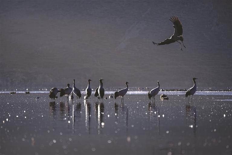 來到卡孜水庫(kù),只見水面上薄霧未散,黑頸鶴的鳴叫聲劃破靜謐,那聲音清亮卻不刺耳,像帶著高原特有的通透感,時(shí)而短促清脆伴著水波蕩漾的輕響,似乎在訴說著高原的故事。循聲望去,幾只黑頸鶴正在湖面上悠然佇立,修長(zhǎng)的脖頸微微彎曲,倒映在平靜的水面上,宛如水墨畫卷中的靈動(dòng)筆觸;忽然間,幾只黑頸鶴率先舒展雙翼,寬大的翅膀劃破晨霧,腳掌蹬離水面時(shí)濺起細(xì)碎的水花,身姿矯健地朝著高空飛去,其余黑頸鶴也相繼展翅,追隨同伴的身影扶搖而上,朝著村落方向飛去。當(dāng)它們從錯(cuò)落有致的村民住房上空掠過時(shí),晨光恰好穿透薄霧,灑在灰褐色的羽翼上,下方屋頂升起裊裊炊煙,動(dòng)靜之間,勾勒出一幅人與自然和諧共生的鮮活圖景。