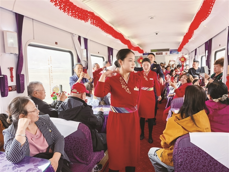 針對高原旅游特殊性及“銀發(fā)族”為主的客群特點,中國鐵路青藏集團(tuán)有限公司持續(xù)升級服務(wù)保障體系,讓旅途兼具安全性與舒適度。車輛方面,該公司完成適老化與舒適化改造,打造2組普惠型旅游專用車組,入藏專列均采用全列有氧臥鋪車廂,配備彌散式供氧系統(tǒng)、專用發(fā)電車及精品餐車,有效緩解旅客高原反應(yīng)。服務(wù)方面,該公司組建“導(dǎo)游+乘務(wù)+醫(yī)護(hù)”三位一體復(fù)合型服務(wù)團(tuán)隊,全程提供健康監(jiān)測、文化講解、應(yīng)急保障等全流程陪伴服務(wù);車廂內(nèi)以民族紋飾、剪紙窗花營造地域氛圍,文藝小分隊沿途獻(xiàn)上藏族歌曲、舞蹈等特色表演,餐車則供應(yīng)烤羊腿、牦牛酸奶、特色奶茶等地方風(fēng)味美食,讓旅程更加舒適美好。運營模式上,該公司采用“晚上開行、白天游玩、邊走邊?!钡脑O(shè)計,途經(jīng)玉珠峰、沱沱河、羌塘草原等高原奇景,在海拔5072米的唐古拉站、措那湖等標(biāo)志性地點定點???,讓游客在休息中跨越山海,充分領(lǐng)略雪域風(fēng)光。同時,該公司強化公鐵聯(lián)運與景區(qū)接駁,推出“旅游小管家”一站式服務(wù),確保游客“行得順暢、吃得地道、玩得盡興”。