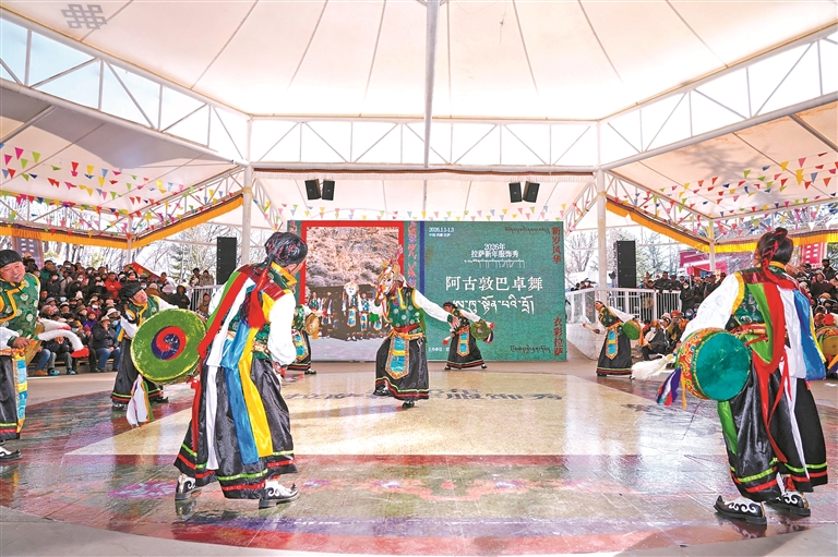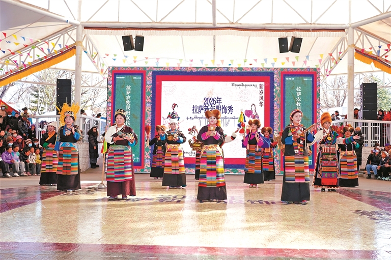 圖為2026拉薩新年服飾秀拉薩農(nóng)牧民婦女代表“村T秀”宗角祿康公園活動(dòng)現(xiàn)場(chǎng)。