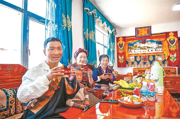 定結(jié)縣乃村村民在喝新房里的第一杯酥油茶。西藏日報(bào)記者 旦增嘎瓦 攝