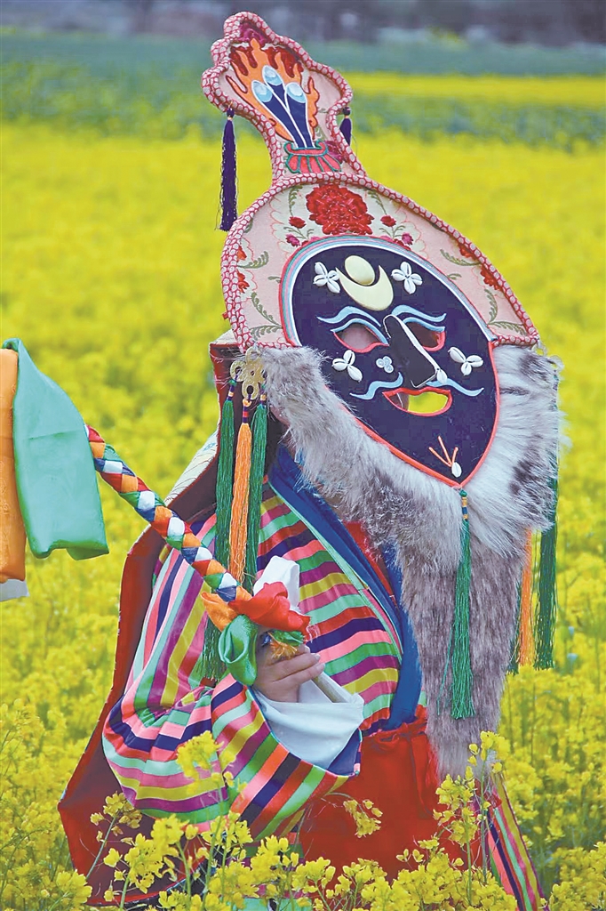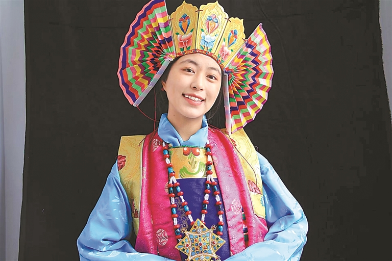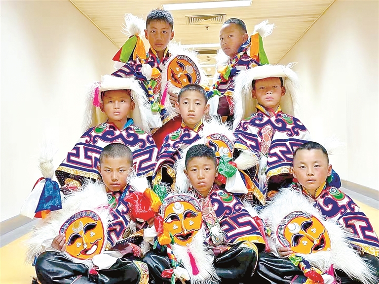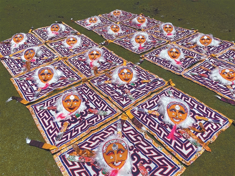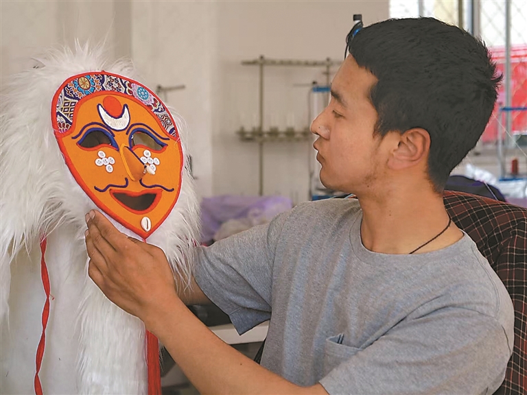 花至少三天時間制作一個大的藍(lán)面具,用一周左右制作一套藏戲服裝……在米瑪堅(jiān)才手里,一抹抹絢麗的色彩渲染著角色的命運(yùn),一道道清晰的刻痕勾勒出故事的輪廓。