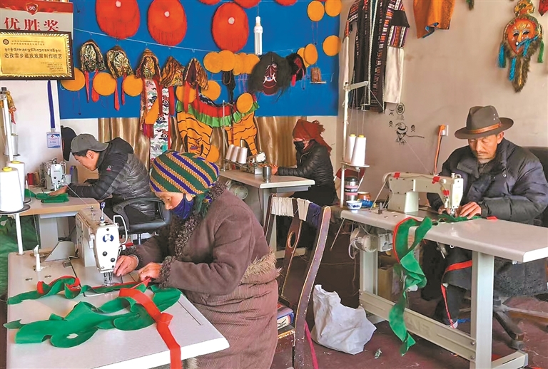 達(dá)孜區(qū)雪鄉(xiāng)阿古傳統(tǒng)藏戲服飾農(nóng)牧民專業(yè)合作社員工在制作藏戲服飾。