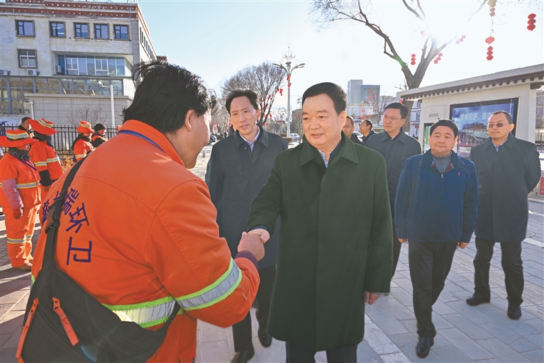 1月27日,自治區(qū)黨委書記王君正在拉薩市檢查春節(jié)、藏歷新年節(jié)前市場(chǎng)供應(yīng)保障等工作。這是王君正在拉薩市城關(guān)區(qū)金珠中路,看望慰問正在作業(yè)的環(huán)衛(wèi)工人。本報(bào)記者 旦增西旦 攝