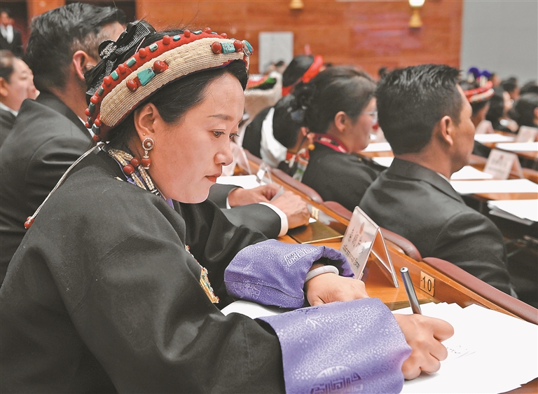 人大代表們在認(rèn)真聽會。記者 洛桑 攝