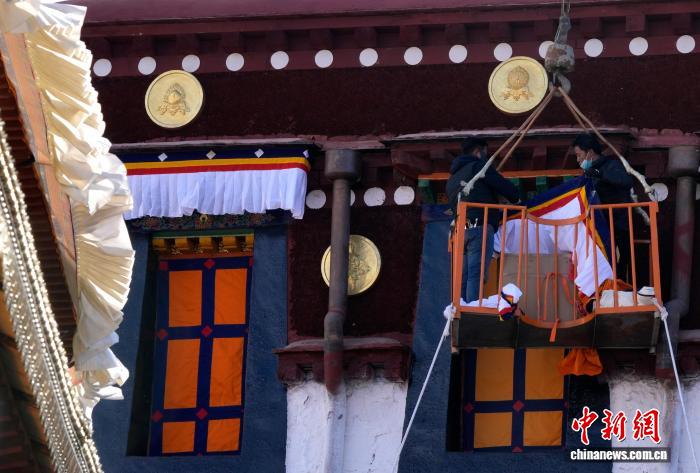 2月5日,西藏大昭寺更換“香布”,迎藏歷新年。“香布”是藏式建筑的裝飾,通常用五彩棉布縫制,主體為白色,搭配紅藍黃等色的邊沿,對窗沿等的顏料及木構(gòu)件起到保護作用。圖為工人們正乘坐吊車更換大昭寺“香布”。中新社記者 李林 攝