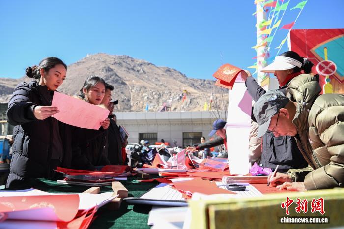 圖為書法家免費(fèi)給村民寫對(duì)聯(lián)。中新社記者 貢嘎來(lái)松 攝