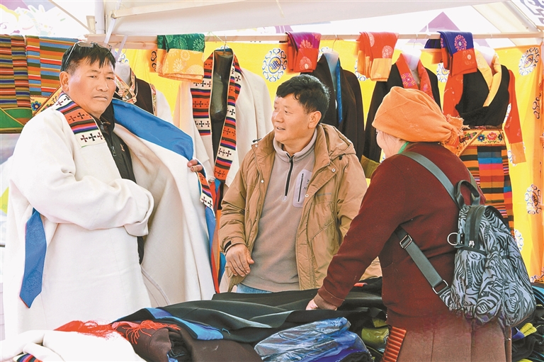 來自達孜區(qū)邦堆鄉(xiāng)的普珍阿佳,帶著自家以傳統(tǒng)方法釀制的青稞酒,吸引了不少新老主顧前來購買;“90后”創(chuàng)業(yè)者達瓦將藏式紋樣與現(xiàn)代設(shè)計相結(jié)合,制作出的新潮手機殼、帆布包,成為年輕人爭相選購的“尖貨”;書法家桌前排起長隊,他們或送春聯(lián)、或?qū)憽案!弊?;藏戲、民歌表演的舞臺前更是掌聲不斷。