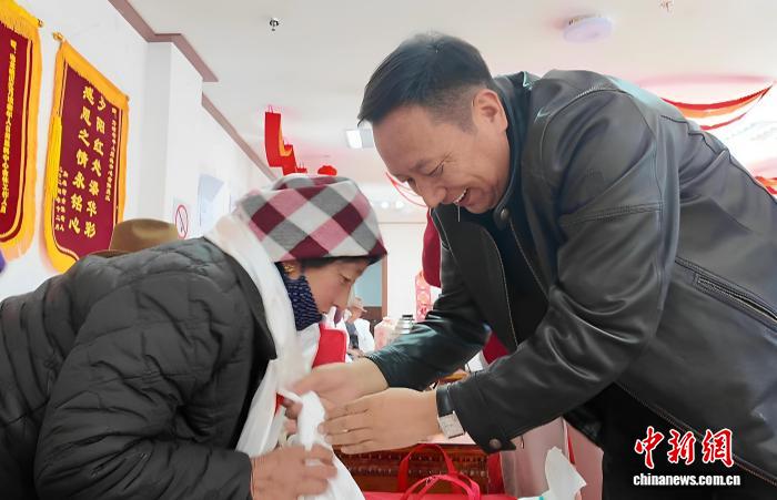圖為西藏長壽未老社會日間照料服務(wù)中心負(fù)責(zé)人為老人獻(xiàn)哈達(dá)、贈慰問品。貢桑拉姆 攝