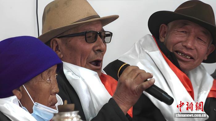 圖為雙節(jié)慶?;顒由?,照料中心老人拿起話筒唱起了吉祥歌曲。貢桑拉姆 攝