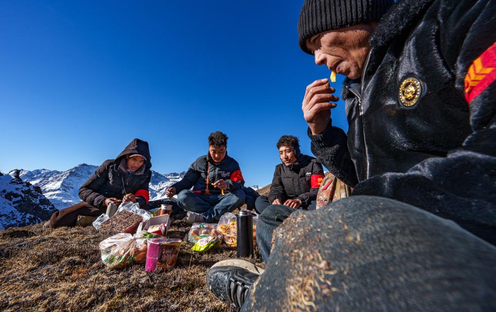 在西藏山南市隆子縣玉麥鄉(xiāng)境內(nèi),護邊員們在巡邏途中吃午飯。新華社記者 丁增尼達 攝