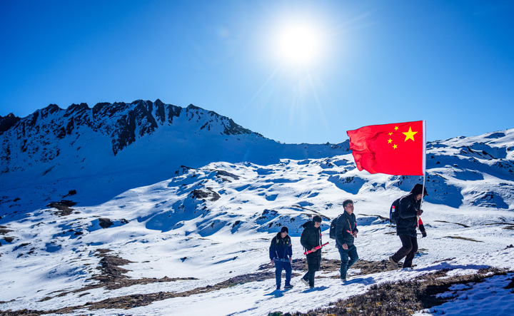 50歲的普布羅布單手舉著五星紅旗,走在隊伍最前面。索朗多吉不時用望遠鏡看向更遠處的雪線。“有沒有人越過邊境,裸露的石頭上有沒有他國的標(biāo)識物……這些都是巡邊要注意的事?!彼f。