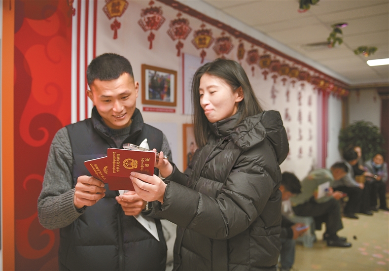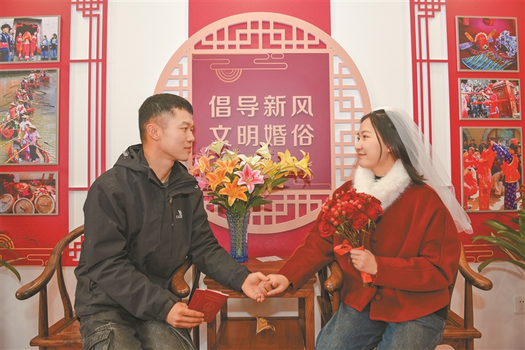 圖為新人拍攝結(jié)婚證分享喜悅。記者 潘多 攝