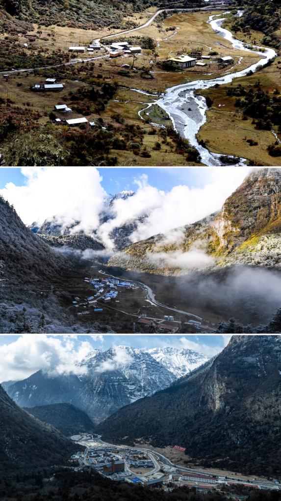 拼版照片:上圖是2003年10月26日拍攝的玉麥鄉(xiāng)(新華社記者索朗羅布攝);中圖是2017年10月31日拍攝的玉麥鄉(xiāng)(新華社記者普布扎西攝);下圖是2026年2月5日拍攝的玉麥鄉(xiāng)(無人機照片,新華社記者丁增尼達攝)。